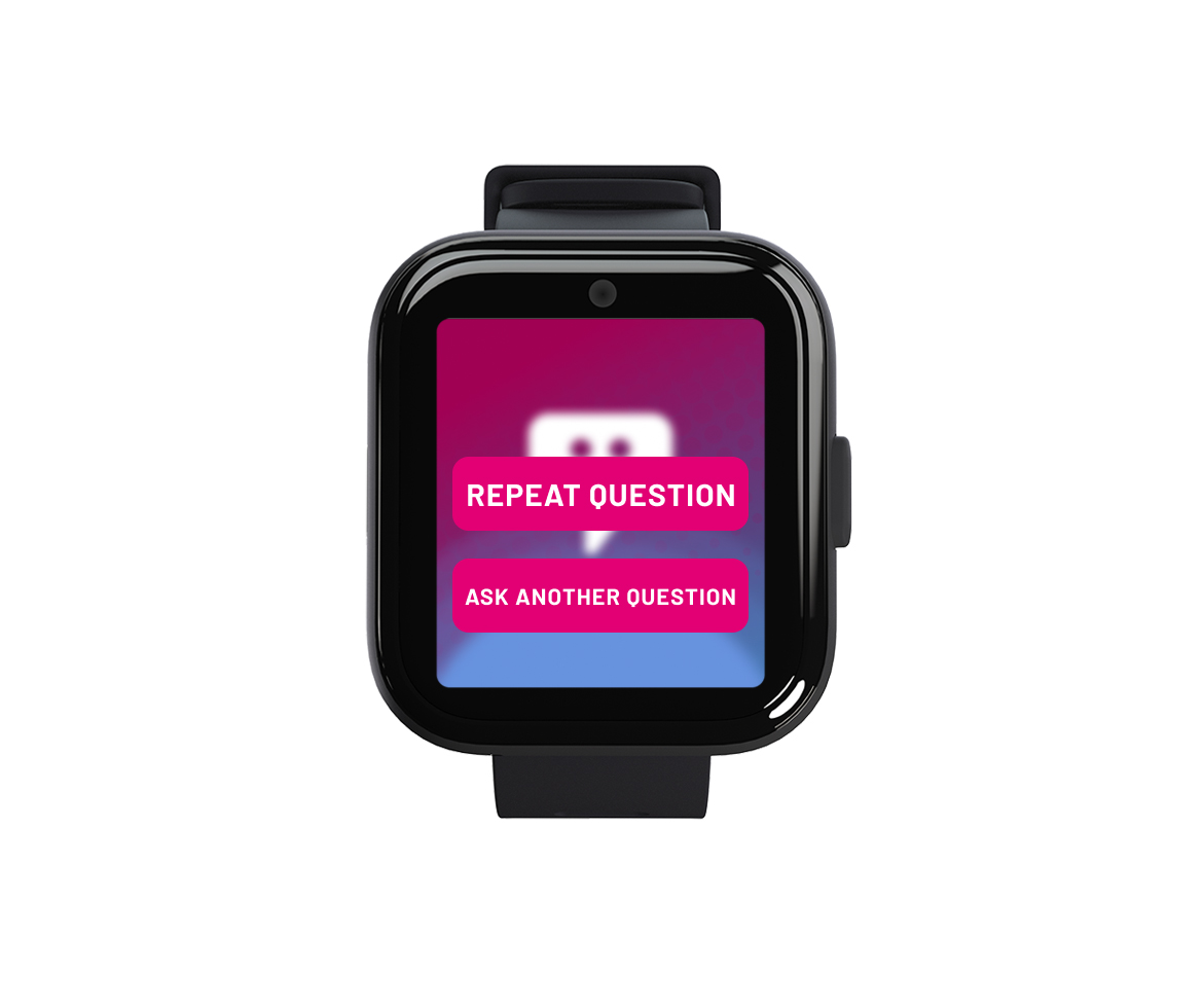 A simple chat layout allows kids to ask questions naturally. The design uses large text, clear buttons, and minimal UI elements so it remains easy to use on a small watch display.